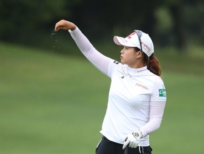 최혜진이 페어웨이에서 잔디를 이용해 바람의 방향을 체크하고 있다. KLPGA 제공
