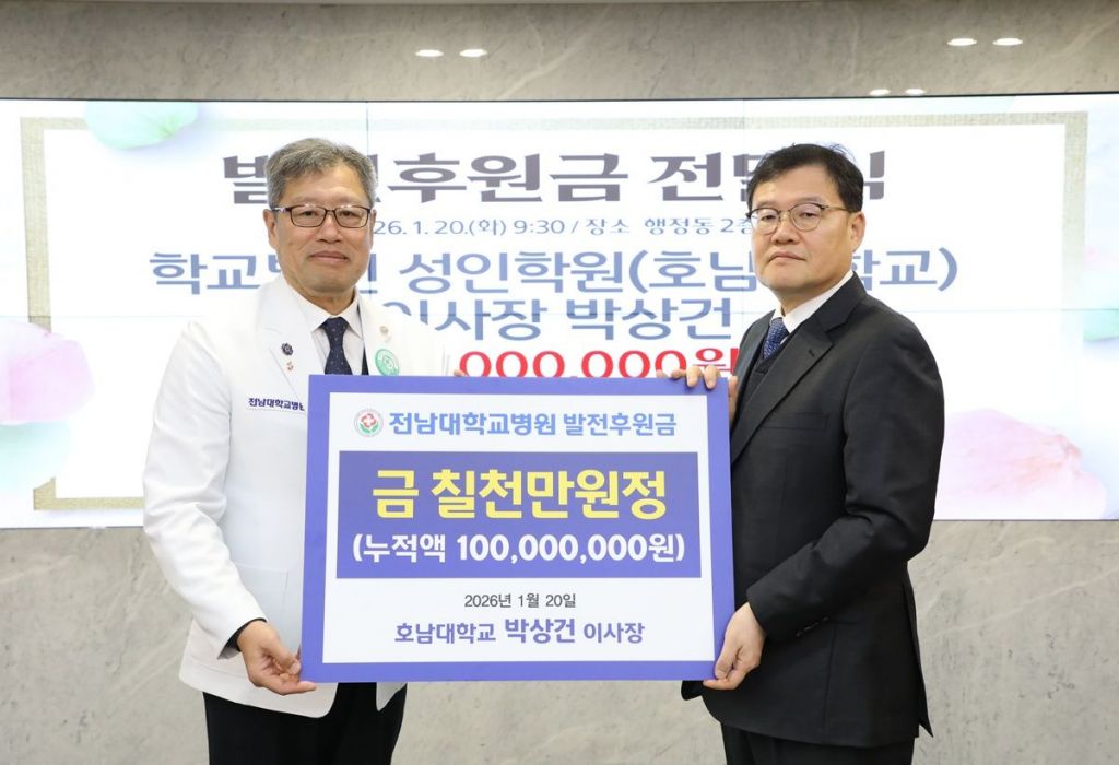 학교법인 성인학원 호남대학교 박상건 이사장이 전남대학교병원에 발전후원금 7,000만원을 기탁했다. 호남대학교 제공