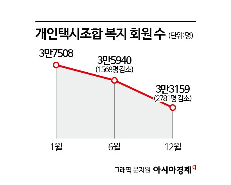22일 아시아경제 취재를 종합하면 서울개인택시 복지회의 회원 수는 지난해 1월 3만7508명에서 12월 3만3159명으로 4000명 이상 줄었다. 매달 퇴직하는 기사와 복지회를 탈회하는 기사가 겹친 결과다.