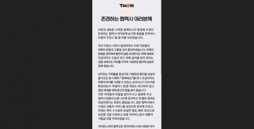 오아시스마켓은 총 181억원을 들여 티몬을 인수했다. 인수대금 가운데 116억원은 티몬 신주 인수에, 나머지 65억원은 미지급 임금과 퇴직금 등에 활용했다. 이에 따라 지난해 8월 티몬의 회생절차가 종결됐고, 오아시스는 피해 셀러(판매자)들에게 3~5%의 업계 최저 수준의 수수료를 적용하는 등 체제를 정비해 지난해 9월경 서비스를 재개하겠다고 밝힌 바 있다.