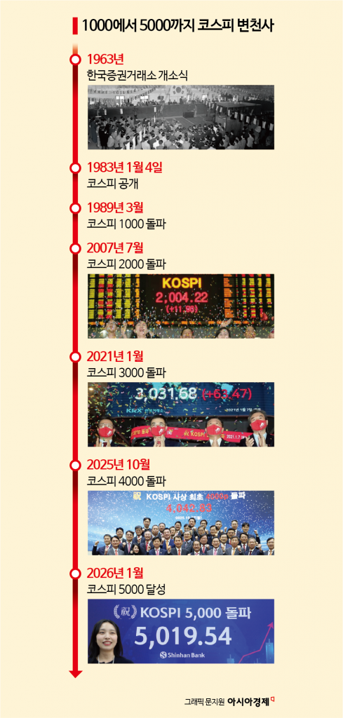 꿈만 같았던 '오천피'가 현실이 됐다. 1956년 대한증권거래소 출범과 함께 역사의 첫 페이지를 펼친 한국 증시는 태동 70주년을 맞은 2026년 새해 코스피 5000 돌파라는 기념비적인 성과를 일궈냈다.