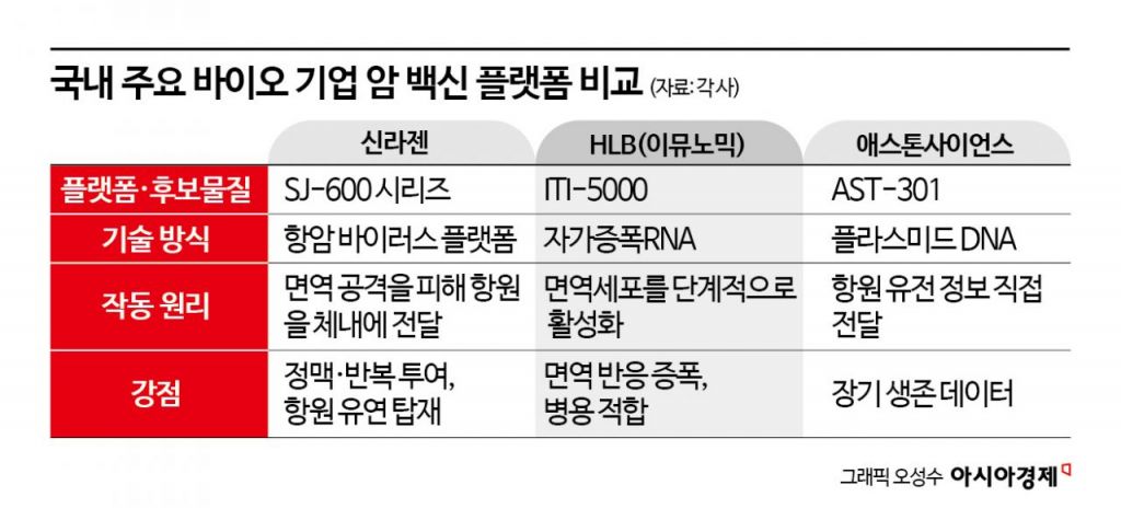 암 백신 상용화가 가시화되면서 독자적인 암 백신 기술을 보유한 한국 바이오 기업들도 재조명되고 있다. 신라젠은 차세대 항암바이러스 플랫폼 'SJ-600 시리즈'를 통해 암 백신 분야로의 확장을 모색하고 있다. SJ-600은 치료 목적에 따라 다양한 항원을 유연하게 탑재할 수 있는 전달 플랫폼이다. 바이러스 표면에 면역계의 보체 반응을 억제하는 단백질 'CD55'를 발현시켜 혈액 내 중화항체의 공격을 회피하도록 했다. 정맥 투여와 반복 투여가 가능하다는 점이 특징이다. 탑재 가능한 유전자의 크기 제약이 적어 환자 맞춤형 항원 등 다양한 유전 정보를 담을 수 있다는 점도 암 백신 플랫폼으로서의 경쟁력으로 꼽힌다. 이동섭 서울대 의대 교수는 앞서 한국세포생물학회 학술대회에서 치료 목적에 따라 다양한 항원을 유연하게 탑재해 송달할 수 있는 '범용 플랫폼'으로서의 기능을 갖추고 있다고 평가하기도 했다.
