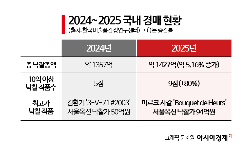 22일 한국미술품감정연구센터 기업부설연구소 카이(KAAAI)가 공개한 '2025년 미술시장 분석보고서'에 따르면, 2025년 국내 미술시장은 출품작 수 감소에도 불구하고 대형 경매사를 중심으로 고가 거래가 이어지며 양적 축소와 질적 성장이 동시에 나타났다. 국내 9개 경매사의 낙찰총액은 1427억원으로 전년 대비 5.16% 증가했으며, 낙찰률과 평균 낙찰가 역시 상승해 블루칩 고가 작품으로의 자본 쏠림 현상이 강화됐다. 반면 중소 경매사와의 격차는 더욱 벌어지며 시장 양극화가 심화된 것으로 분석됐다.