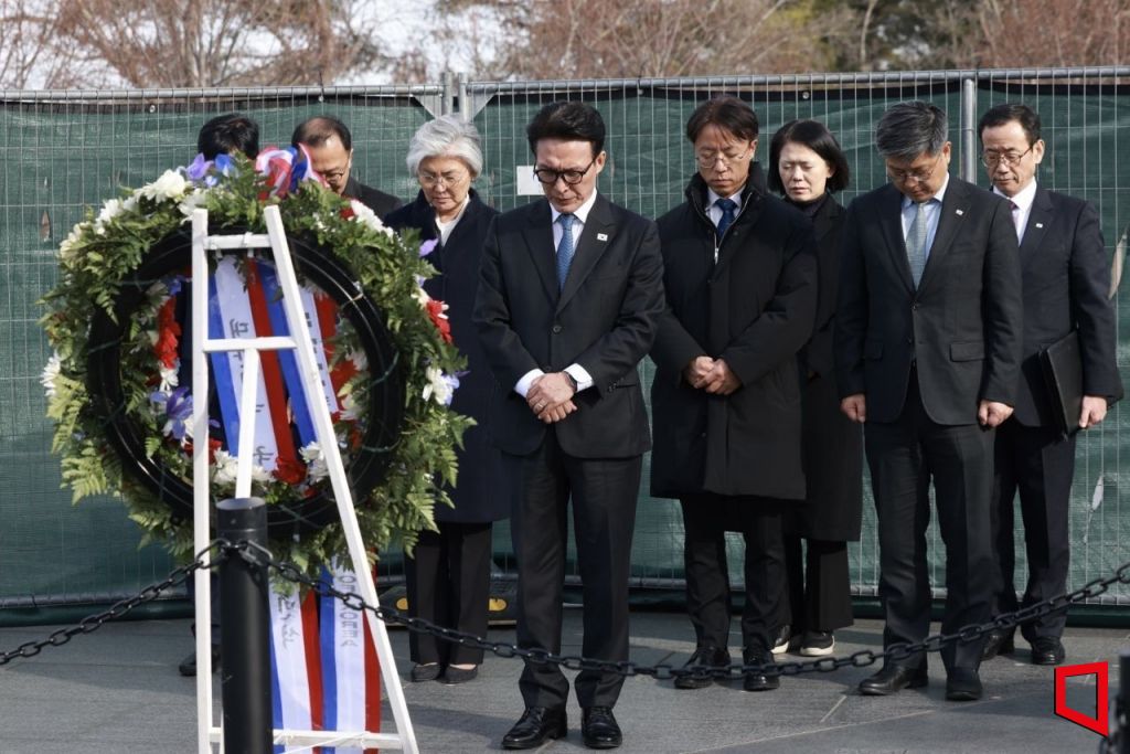 김민석 국무총리가 22일(현지시간) 미국 한국전 참전기념공원을 방문, 헌화 및 묵념을 하고 있다. 2026.1.23 [총리실 제공]