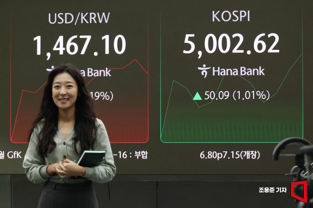 코스피가 장중 5000선을 재돌파한 가운데 23일 서울 중구 하나은행 본점 딜링룸에서 직원이 증시와 환율 등을 모니터하고 있다. 이날 코스피는 전 거래일(4952.53)보다 31.55포인트(0.64%) 상승한 4984.08에 장을 시작했다.