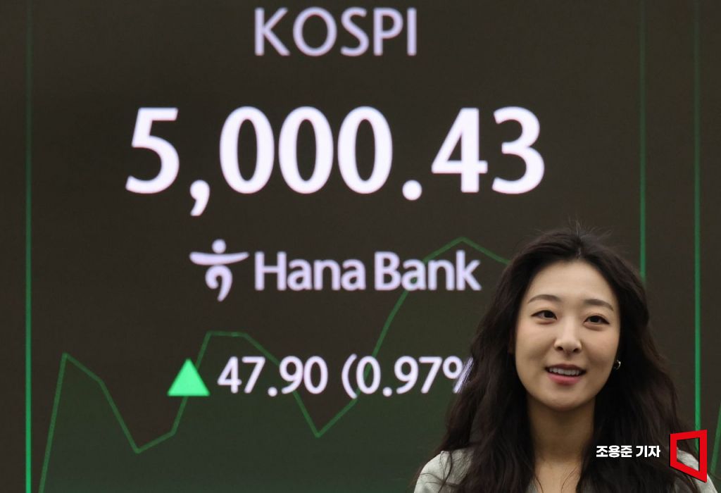 코스피가 장중 5000선을 재돌파한 가운데 23일 서울 중구 하나은행 본점 딜링룸에서 직원이 증시와 환율 등을 모니터하고 있다. 이날 코스피는 전 거래일(4952.53)보다 31.55포인트(0.64%) 상승한 4984.08에 장을 시작했다.