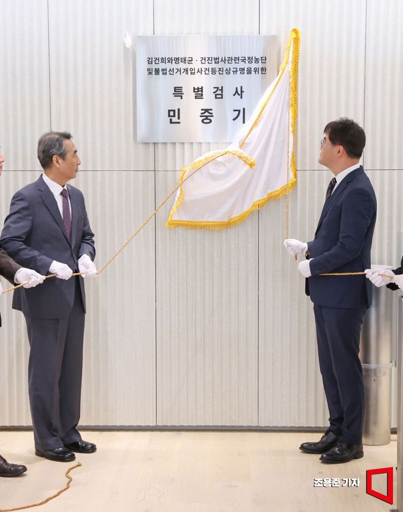윤석열 전 대통령의 부인 김건희 여사 의혹 관련 사건을 맡은 민중기 특별검사를 비롯한 특검보들이 2일 서울 종로구 KT광화문빌딩 웨스트에 마련된 특검 사무실에서 현판 제막을 하고 있다. 2025.7.2 조용준 기자