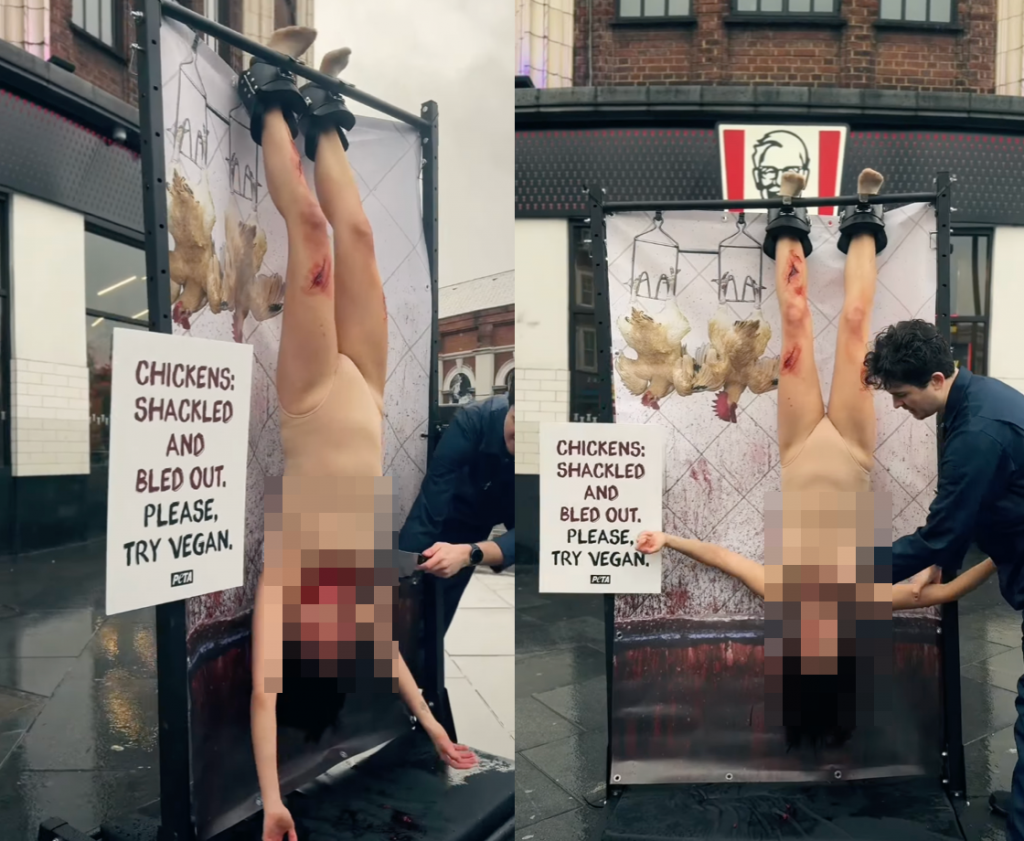 동물보호단체 페타(PETA) 소속 동물권 운동가들이 영국 런던 도심의 KFC 매장 앞에서 닭 도살 과정을 재현하는 퍼포먼스 시위를 벌여 시민들에게 충격을 안겼다. 이들은 자극적인 연출을 통해 식용 닭의 도살 현실을 알리고 동물성 식품 소비 중단을 촉구했다.