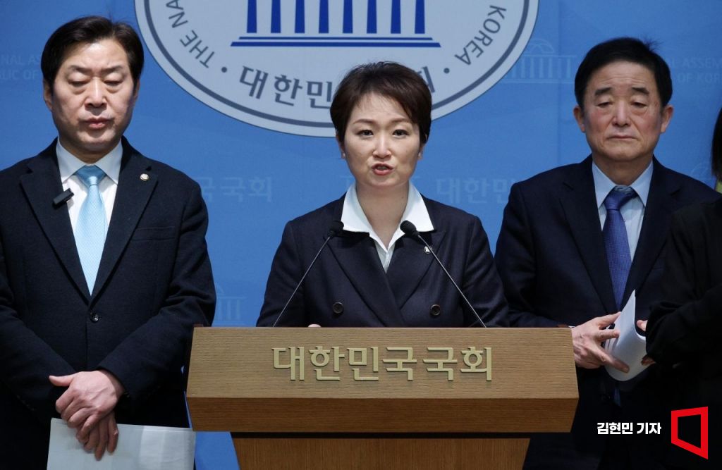 이언주·황명선·강득구 더불어민주당 최고위원이 223일 국회 소통관에서 긴급 기자회견을 하고 있다. 이들은 “정 대표의 독선과 비민주성을 강력히 규탄한다”며 공식 사과와 진상 규명을 요구했다.