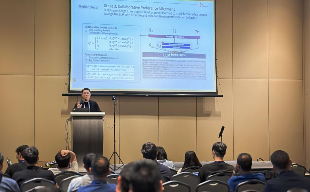 24일 싱가포르에서 열린 ‘AAAI 2026’에서 박정 SKT 데이터분석모델링팀장이 ‘One Model’ 버전 4.0 연구에 대해 ‘현장 발표(Oral Session)’ 중인 모습. 사진제공=SKT