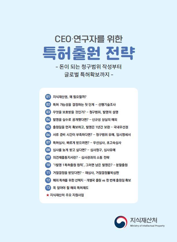 지식재산처는 특허출원을 준비하는 기업 CEO와 연구자가 알아야 할 핵심 전략을 담은 'CEO·연구자를 위한 특허출원 전략'을 발간·배포했다고 25일 밝혔다.