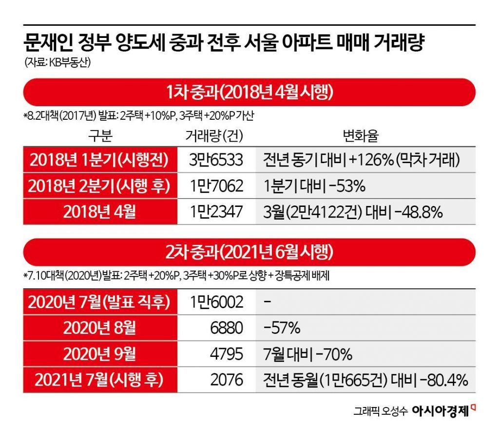 세율을 더 높였던 2021년 상황은 더 심각했다. 정부는 2020년 '7·10 대책'을 통해 중과세율을 2주택 20%포인트, 3주택 30%포인트로 상향하고 장기보유특별공제 혜택마저 없앴다. 시행은 2021년 6월이었지만 시장은 발표 직후부터 얼어붙었다. 2020년 7월 서울 아파트 거래량은 1만6002건이었으나 8월 6880건, 9월 4795건으로 두 달 만에 70% 줄었다. 대책 발표만으로 매물이 잠긴 셈이다.