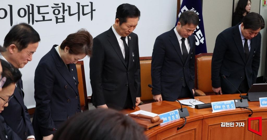 정청래 대표와 한병도 원내대표를 비롯한 더불어민주당 지도부가 26일 국회에서 열린 최고위원회의에서 이해찬 전 국무총리의 별세를 애도하며 묵념하고 있다.