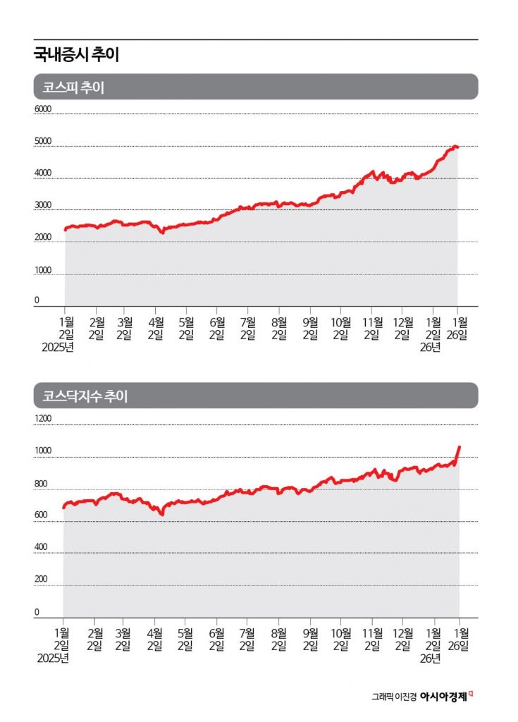 코스피가 5000선을 넘나들면서 상대적으로 덜 오른 코스닥이 주목받고 있다. 지난해 코스피는 인공지능(AI)과 반도체 사이클 회복 기대를 바탕으로 가파른 상승세를 보였지만, 코스닥지수는 변동성만 확대된 채 상승 탄력이 제한됐다. 시장에서는 코스닥지수가 올해 정부의 부양 의지에 힘입어 상승기류를 탈 것으로 보고 있다.