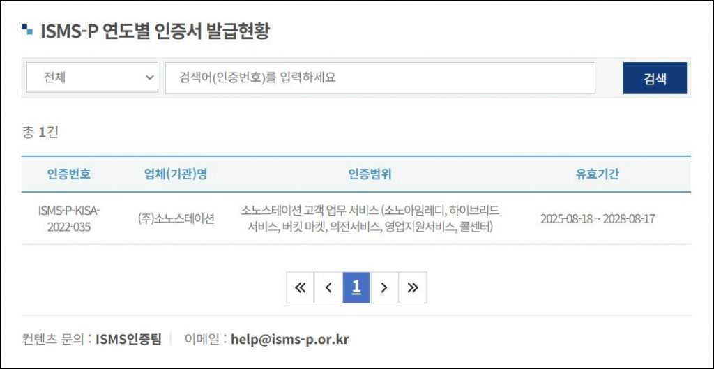한국인터넷진흥원 'ISMS-P 연도별 인증서 발급현황에서 소노스테이션의 인증번호, 인증범위, 유효기간 등을 확인할 수 있다. 한국인터넷진흥원
