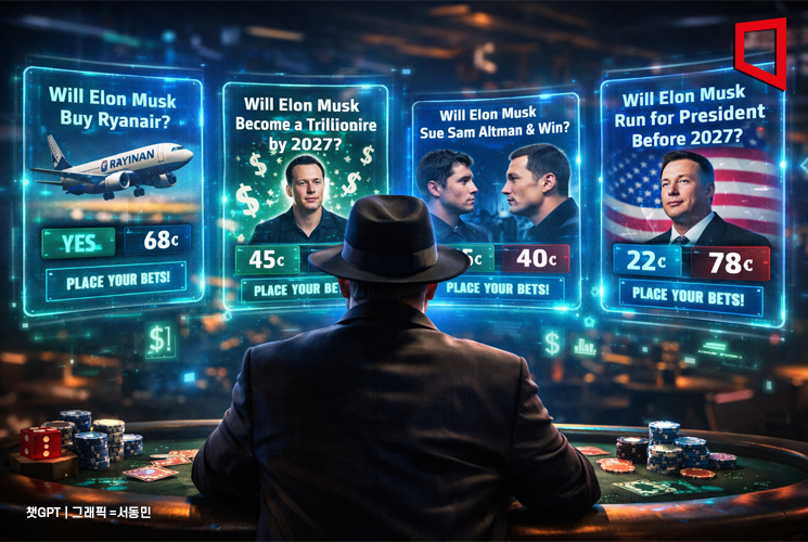 26일(현지시간) 미국의 예측시장 플랫폼 폴리마켓에는 "머스크가 라이언에어(유럽 최대 저가항공사)를 인수할까?", "머스크가 2027년 전에 조만상자(trillionaire)가 될까?", "머스크가 샘 올트먼(오픈AI CEO) 상대 소송에서 승소할까?", "머스크가 2027년 이전에 대통령 출마를 선언할까?" 등 머스크를 둘러싼 다양한 주제가 올라와 있다. 사이트 이용자들은 해당 질문에 대해 동의 또는 반대쪽에 배팅하고, 예측이 맞을 경우 시장에서 형성된 배당률에 따라 수익을 배분받는다.
