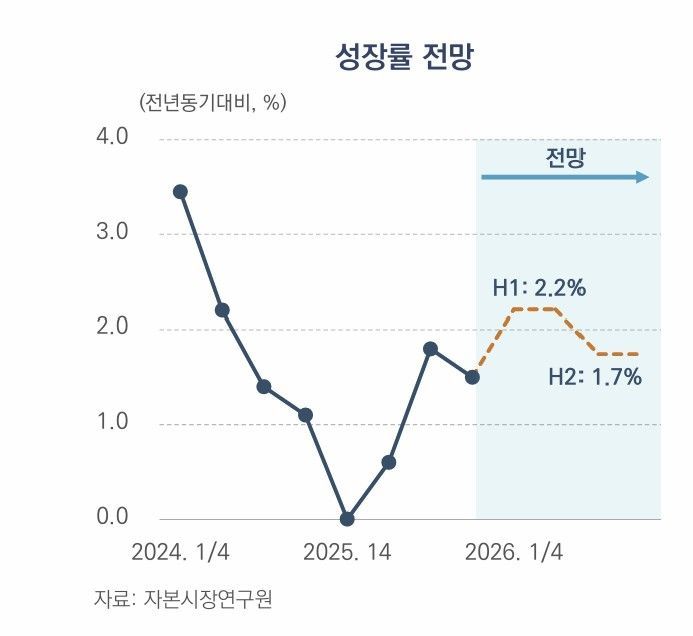 자본시장연구원은 27일 오후 여의도 금투센터에서 '2026년 자본시장 전망과 주요 이슈'를 주제로 세미나를 개최했다. '거시경제 전망' 발표를 맡은 장보성 거시금융실장은 "국내 경기가 완만한 회복세를 보이면서 대체로 안정적인 물가 상황이 유지될 전망"이라며 "2026년 국내총생산(GDP)은 2.0% 성장률을 보일 것"이라고 밝혔다. 지난해 1% 성장을 예상했던 것에 비해 확연히 개선된 수치다. 구체적으로 상반기에는 2.2%, 하반기에는 1.7%로 예상됐다.