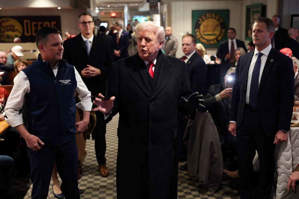도널드 트럼프 미국 대통령이 27일(현지시간) 아이오와주의 한 식당을 방문해 공화당 잭 넌(아이오와주) 연방 하원의원과 함께 참석자들 앞에서 발언하고 있다. AFP연합뉴스