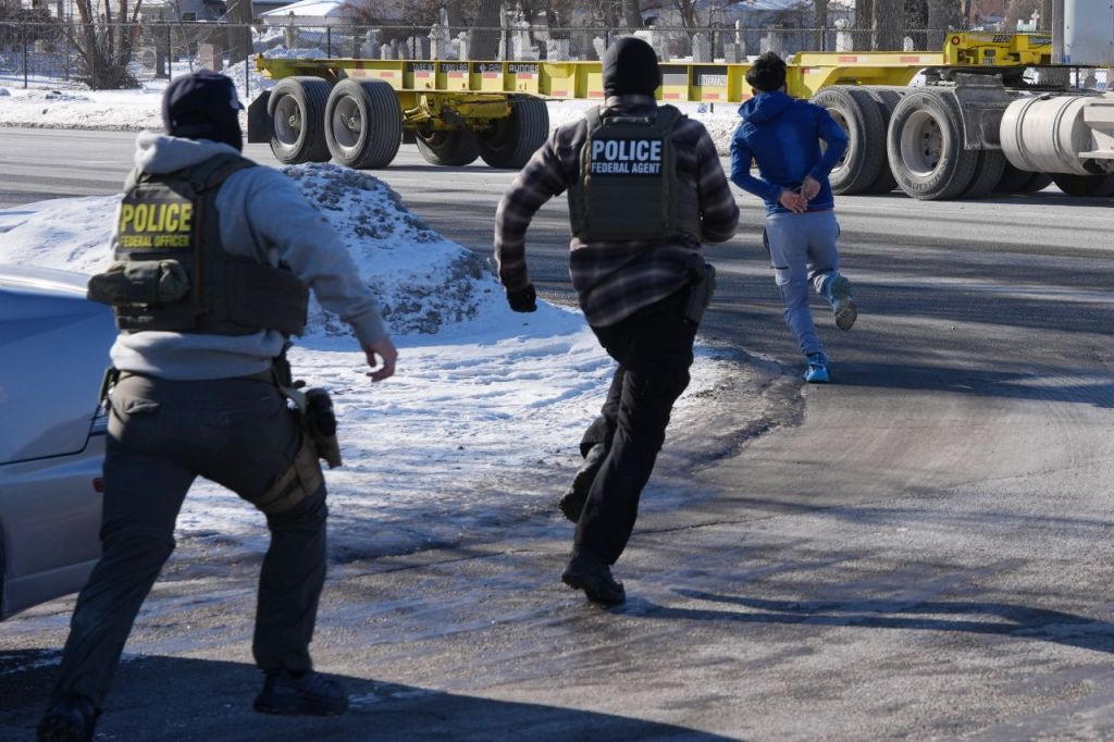 지난 27일(현지시간 )미국 미네소타주 미니애폴리스에서 한 남성이 연방 이민 당국 요원들에게 체포되는 것을 피하기 위해 수갑을 찬 채 달리고 있다. AP연합뉴스