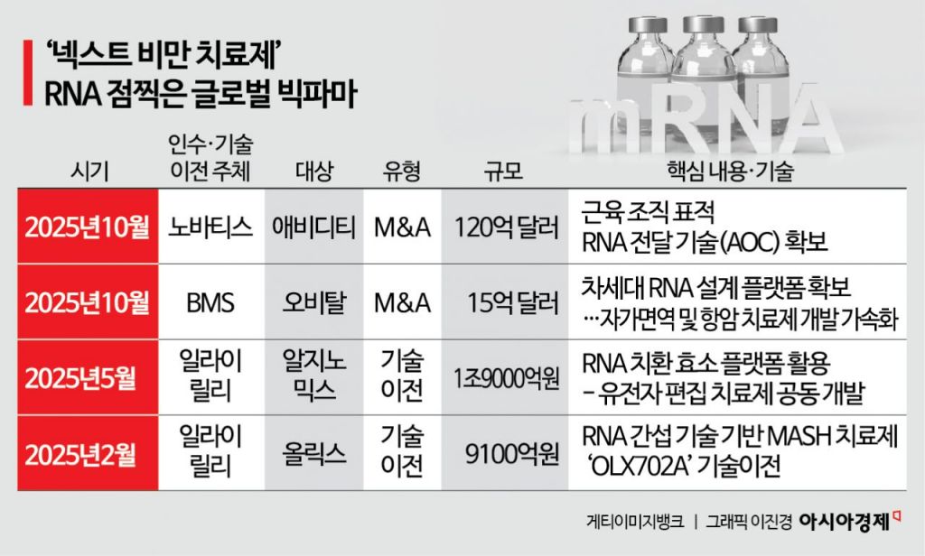 28일 업계에 따르면 지난해 하반기부터 이어진 빅파마들의 공격적인 M&A(기업 인수합병)와 기술이전 계약은 RNA 치료제가 주류 시장으로 진입했음을 알리는 신호탄으로 받아들여진다. 노바티스는 지난해 10월, 근육 조직으로의 RNA 전달 기술을 보유한 애비디티 바이오사이언스를 약 120억달러(약 17조2260억원)에 인수하는 '메가 딜'을 터뜨렸다. 현재 마무리 단계인 이 인수가 1분기 중 완료되면 노바티스는 후기 단계의 RNA 파이프라인을 단숨에 확보하게 된다. 브리스톨 마이어스 스퀴브(BMS) 역시 지난해 10월 RNA 기반 치료제 기업 오비탈 테라퓨틱스를 15억달러(약 2조1532억원)에 인수하며 전장에 합류했다.