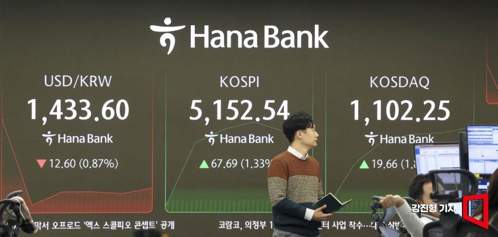 코스피 지수가 장중 사상 첫 5100선을 돌파한 28일 서울 중구 하나은행 딜링룸에서 딜러들이 업무를 보고 있다. 이날 코스닥 지수는 장중 1100선을 돌파 했으며, 원달러 환율은 전 거래일 대비 15.2원 내린 1431원에 거래를 시작 했다. 2026.1.28 강진형 기자