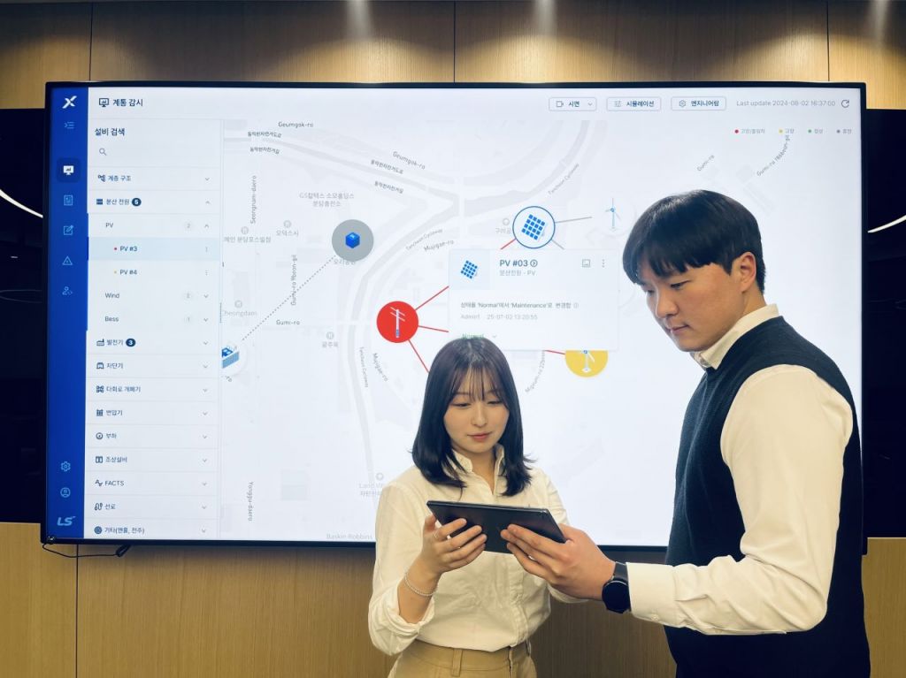 LS일렉트릭 임직원들이 ‘정전관리시스템(OMS)’ 계통감시 화면을 통해 배전망 상태를 점검하고 있는 모습. LS일렉트릭