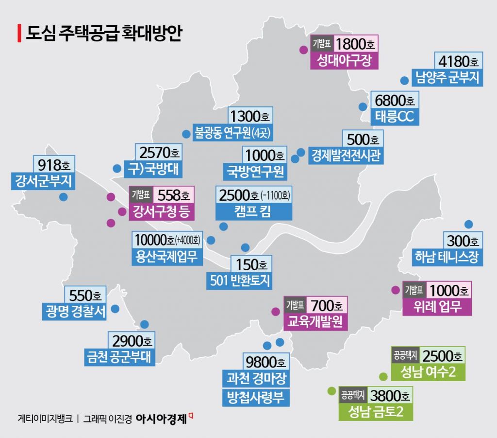 정부가 29일 '도심 주택공급 확대 및 신속화 방안'을 내놓으면서 구체적인 부지나 착공 시점을 확정했다. 직주근접 등을 감안해 도심권 주택수요가 높은 점에 착안, 서울 용산 등 기존에 추진하던 사업계획의 규모를 늘리는 한편 과거 주민반발 등으로 사업 추진이 불발됐던 지역도 대거 포함시킨 게 특징이다. 정부는 여의도 면적의 1.7배에 달하는 신도시급 면적(487만㎡)이라고 밝혔다. 국토교통부를 중심으로 관계부처가 중지를 모은 가운데 향후 실행력이 관건이 될 것으로 예상된다.