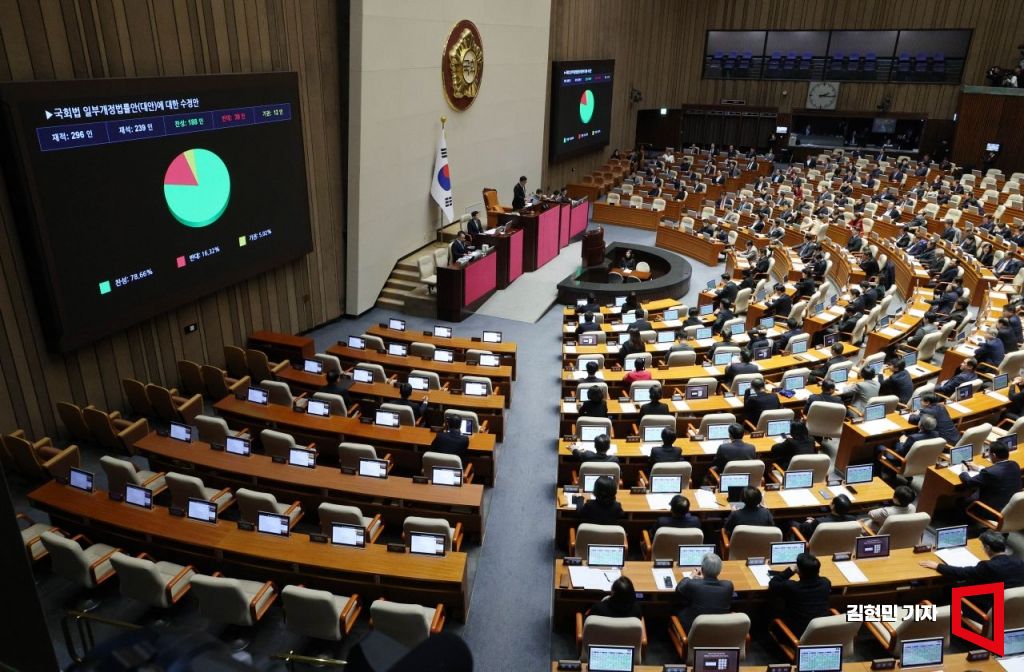 29일 국회에서 열린 본회의에서 국회법 일부개정법률안(대안)에 대한 수정안이 가결되고 있다. 2026.1.29 김현민 기자