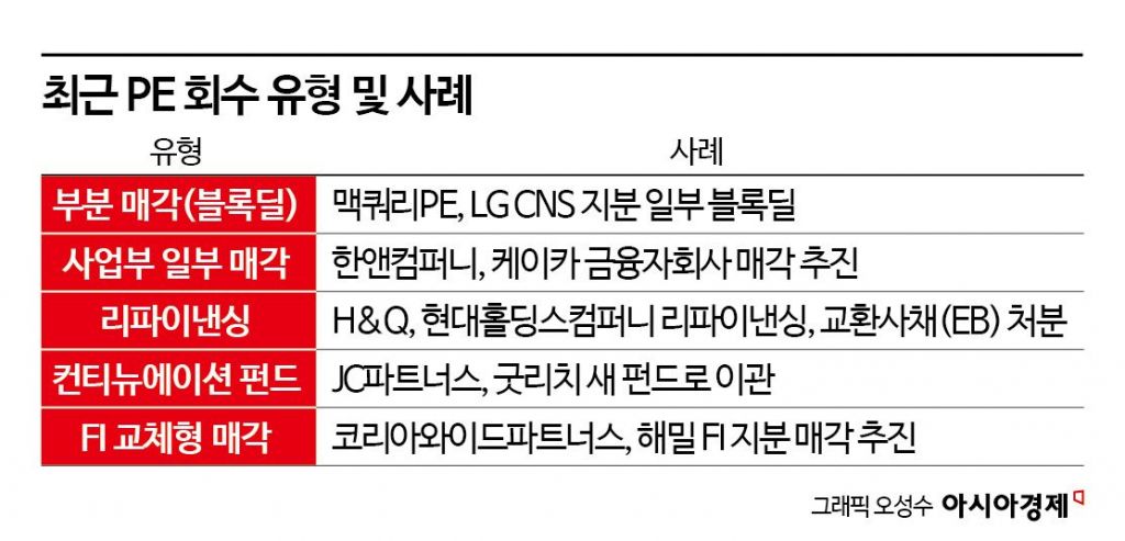 가장 최신 사례는 외국계 운용사 맥쿼리프라이빗에쿼티(PE)의 LG CNS 지분 매각이다. 맥쿼리PE는 최근 LG CNS 지분 800만주(8.3%)를 약 5360억원 수준에 블록딜(시간 외 대량 매매)을 진행했다. 지난해 하반기부터 올해 초까지 세 차례에 걸쳐 LG CNS 지분을 블록딜 방식으로 분할 매각하며 단계적으로 투자금을 회수한 것이다.
