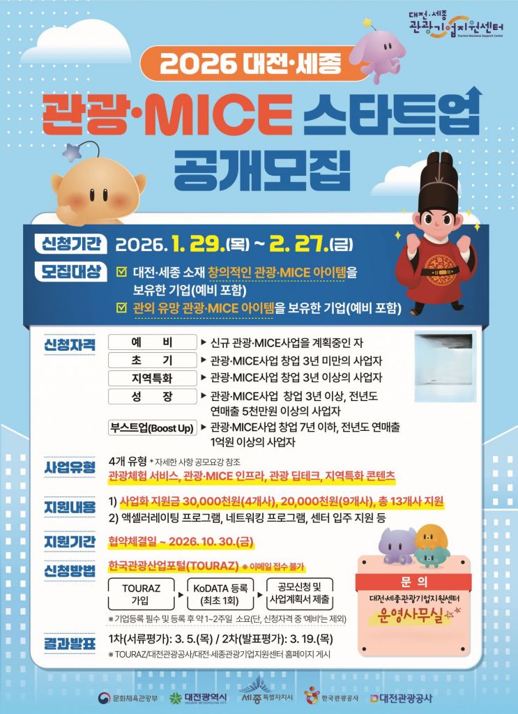 대전관광공사가 대전·세종 지역의 창의적이고 혁신적인 유망 스타트업 발굴 및 지원을 통한 관광·MICE 창업 생태계 조성을 위해 '2026 대전·세종 관광·MICE 스타트업'을 공개 모집한다.