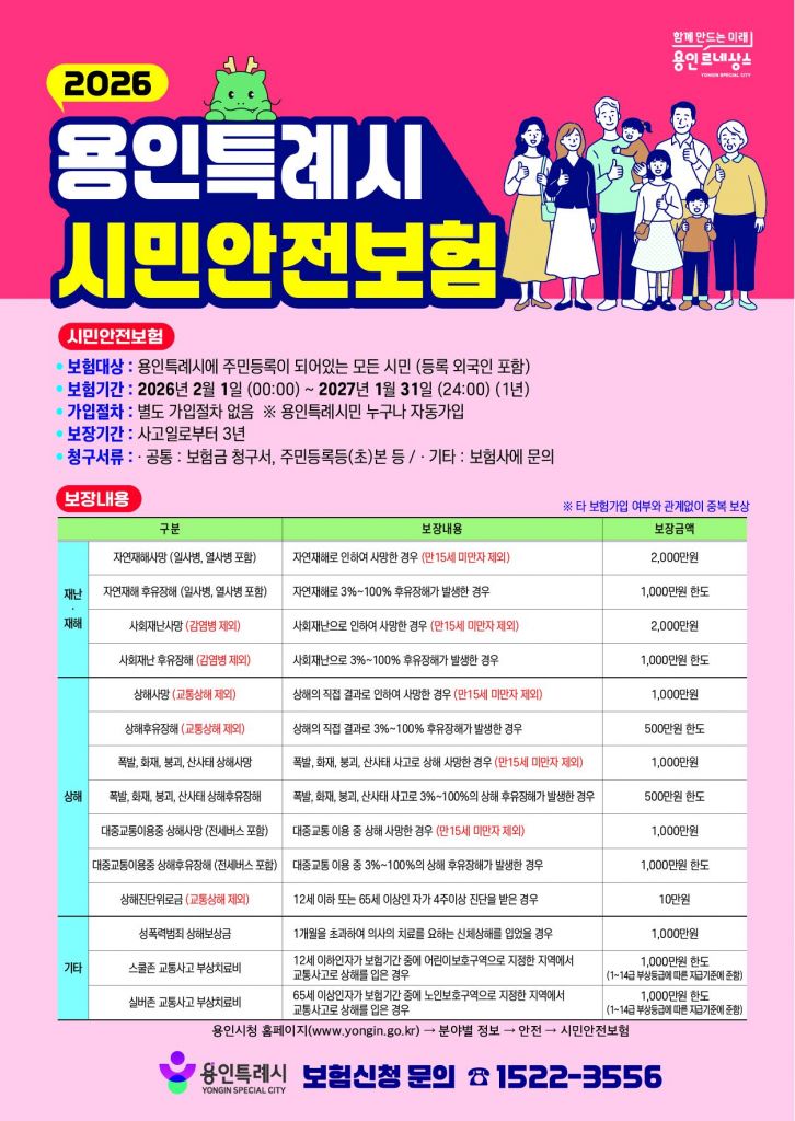 '시민안전보험'은 주민등록법상 용인에 주소를 둔 시민이라면 누구나 별도의 가입 절차나 비용 부담 없이 보장받는 보험이다. 등록외국인, 외국국적동포 국내거소신고자도 보장 대상자에 포함된다.