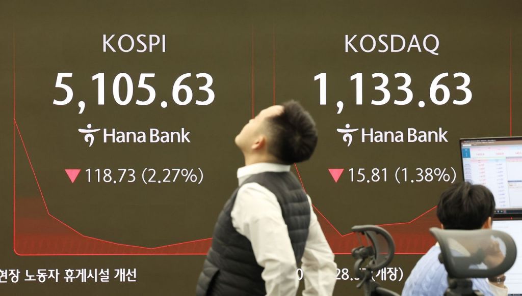 코스피가 하락 출발하며 장 초반 5100선이 깨진 2일 서울 중구 하나은행 딜링룸 현황판에 코스피와 코스닥지수가 표시되고 있다. 연합뉴스