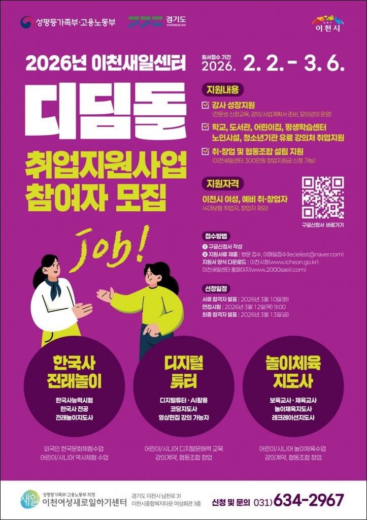 희망자는 이천새일센터에 방문 접수하거나, 포스터의 QR코드를 통해 온라인 신청하면 된다. 동아리 지원자는 동아리 신청서와 이력서, 자기소개서 등 필요한 서류를 제출해야 한다.