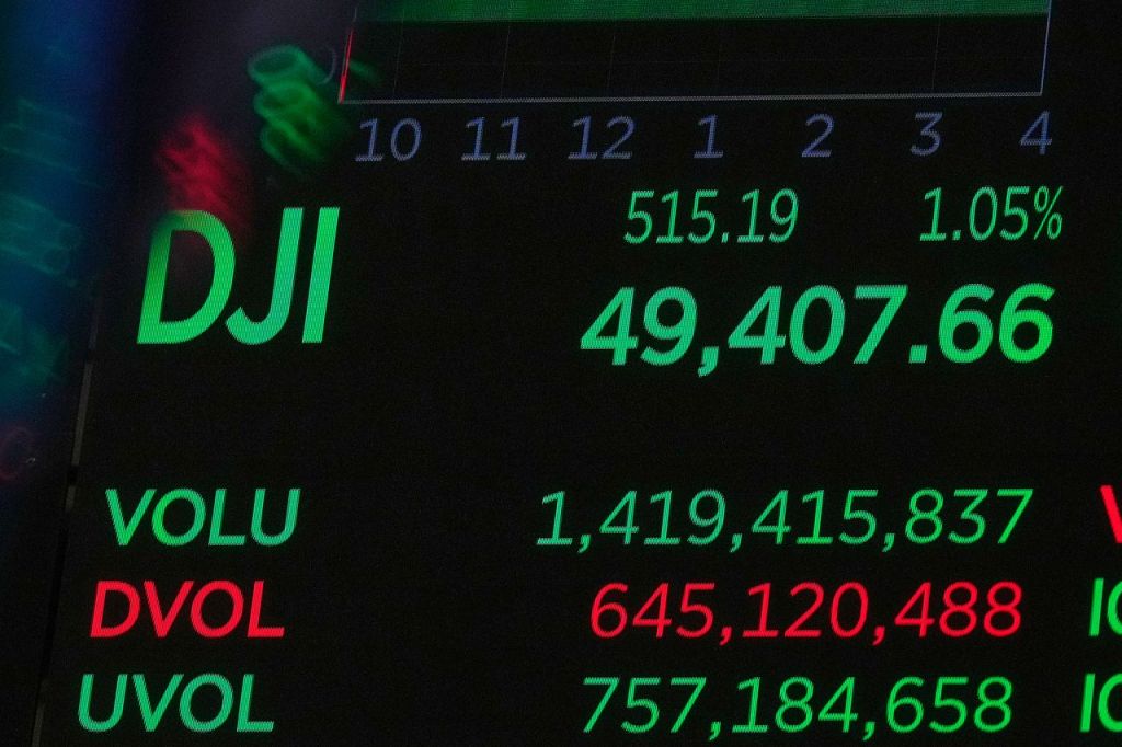 2일(현지시간) 뉴욕 증권거래소 거래장 상단의 전광판에 다우존스 산업평균지수의 종가가 표시되고 있다. 뉴욕(미국)=AP 연합뉴스.