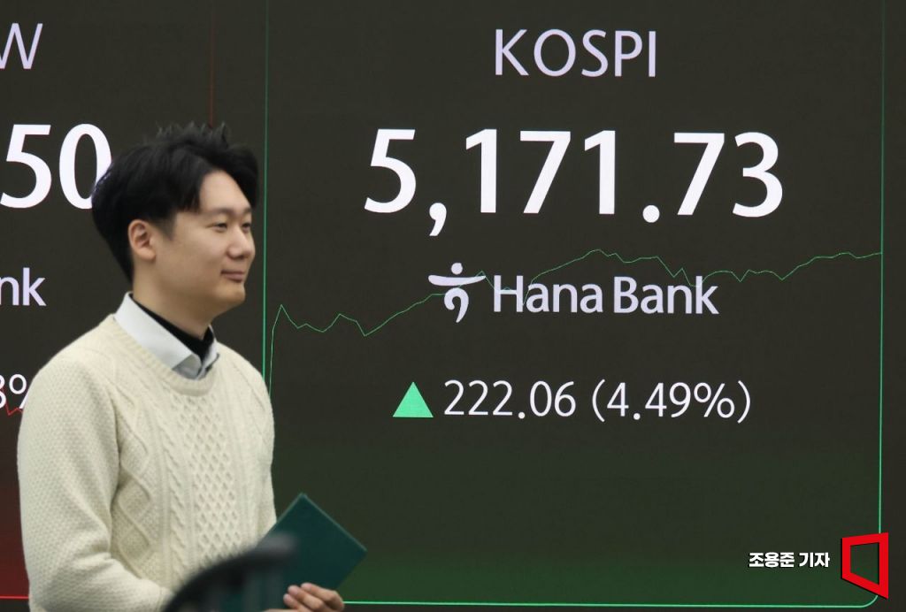 코스피가 폭락 하루만에 4% 이상 급등세에 매수 사이드카(프로그램매수호가 일시효력정지)가 발동된 3일 서울 중구 하나은행 본점 딜링룸에서 직원이 증시와 환율 등을 모니터하고 있다. 이날 코스피 지수는 전장 대비 165.14포인트(3.34%) 오른 5114.81에 장을 시작했다. 2026.2.3 조용준 기자