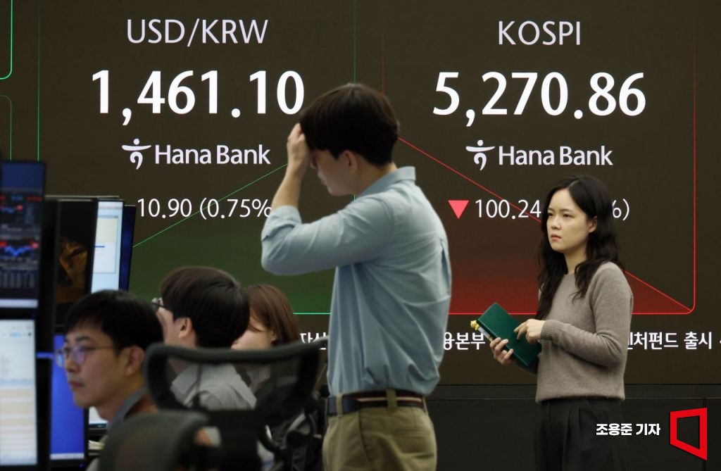 5일 서울 중구 하나은행 본점 딜링룸에서 직원이 증시와 환율 등을 모니터하고 있다. 이날 코스피는 전 거래일(5371.10)보다 120.07포인트(2.24%) 하락한 5251.03에 원·달러 환율은 10.8원 오른 1461.0원에 장을 시작했다. 2026.2.5 조용준 기자