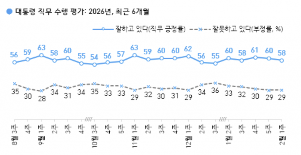 6일 여론조사업체 갤럽이 공개한 여론조사(3~5일 전국 18세 이상 1001명을 대상으로 무선전화 인터뷰 방식으로 진행. 표본오차는 95% 신뢰수준에 ±3.1%포인트, 응답률은 12.2%)에 따르면 이 대통령이 직무 수행과 관련해 '잘하고 있다'는 응답은 58%로 조사됐다. 지난주 조사와 비교해 2%포인트 하락했다. 직무 수행을 '잘못하고 있다'는 부정평가는 29%로 지난주와 같았다.