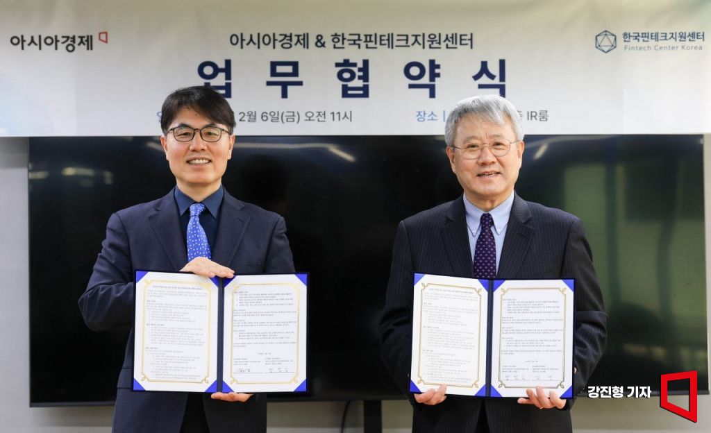장범식 아시아경제 대표(오른쪽)와 김건 한국핀테크지원센터 이사장이 6일 서울 마포구 프론트원에서 열린 '아시아경제-한국핀테크지원센터, 디지털자산 및 핀테크 산업 협력 업무협약식'에 참석해 업무협약을 마친 뒤 기념촬영 하고 있다.
