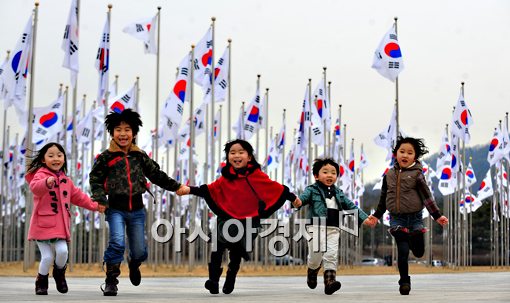 27일 충남 독립기념관을 찾은 어린이들이 90돌을 맞은 3.1절을 기념해 조성된 815개의 태극기 광장을 가로지르며 힘차게 달려나가고 있다.
