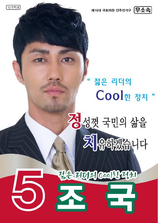 또 다른 포스터는 무소속 기호5번 조국의 늠름한 공식 선거 포스터로 ‘젊은 리더의 Cool한 정치! 정성껏 국민의 삶을 치유하겠습니다’라는 문구가 적혀 있다. 조국은 미래가 언급한 "이상적인 ‘정치’란 ‘정’성껏 국민의 삶을 ‘치’유하는 것이다"라는 명언을 포스터에 그대로 인용했다.