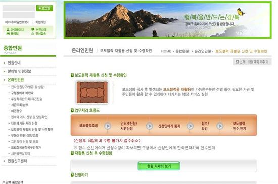 이를 개선하기 위해 구는 강북구청 홈페이지(http://www.gangbuk.seoul.kr) 첫 화면에 '보도블럭 재활용' 메뉴를 신설, 보도블록이 필요한 주민들은 누구나 쉽게 공급받을 수 있는 시스템을 구축했다.