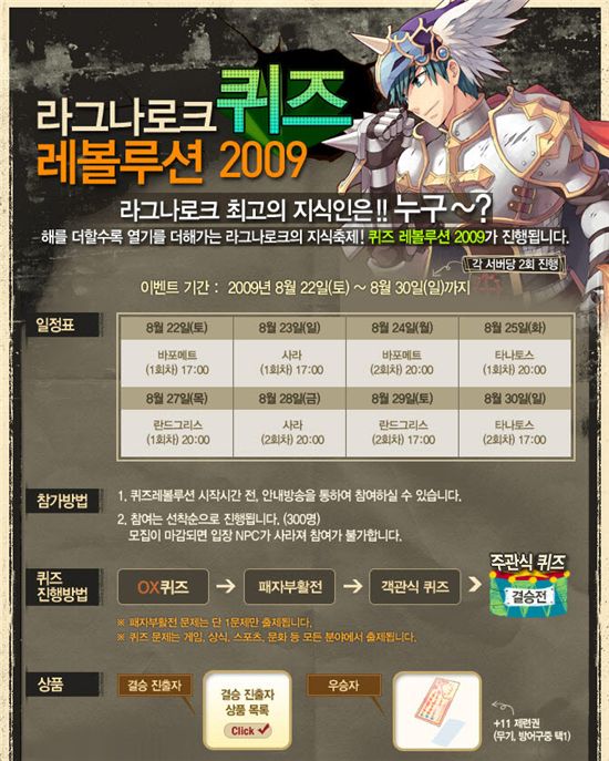 그라비티(대표 오노 도시로, 강윤석)는 ‘라그나로크 온라인’이 최고 지식인을 뽑는 ‘도전 2009 퀴즈 레볼루션’ 이벤트를 실시한다고 21일 밝혔다.