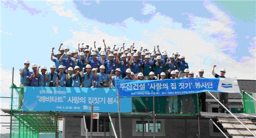 두산건설 사회공헌 자원봉사단 정우회 회원 등 임직원들이 강원도 춘천시 신북읍 천전리에서 사랑의 집 짓기 봉사활동을 펼쳤다.