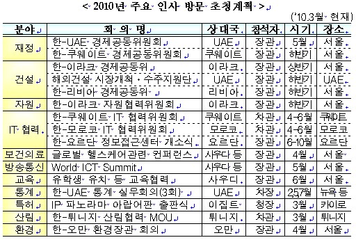 정부는 이를 위해 개별 프로젝트 위주의 협력보다는 중동의 복합적 수요에 대응해 하드웨어와 소프트웨어를 결합한 종합적 협력방안을 마련할 계획이다. 또 정보통신(IT) 기술 등 중동의 관심분야 정책을 지원함으로써 중장기적으로 지속가능한 경제협력 기반을 구축하기로 했다.