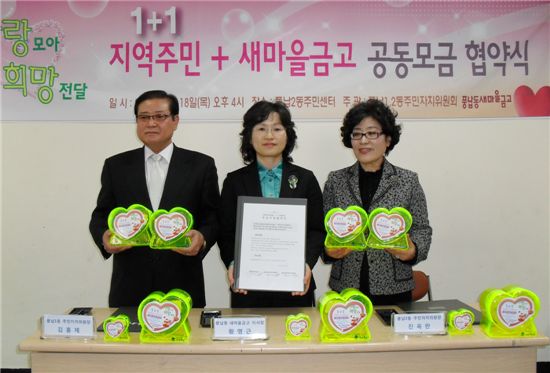 송파구 풍납2동은 동 주민자치위원회(위원장 진옥란)가 주관하고 풍납동 새마을금고가 후원하는 '1+1 사랑의 동전 모으기 모금사업'을 연중 진행하기로 하고 18일 오후 4시 풍납2동 주민센터 사랑방에서 '1+1 사랑의 동전모으기 모금사업'협약식을 가졌다.