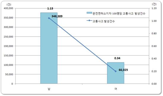 이를 운전면허소지자 100명당 교통사고 발생건수로 비교하면 남성은 1.13건인에 비해 여성은 0.34건으로, 남성이 여성에 비해 약 3.3배 교통사고 발생빈도가 높았다.
