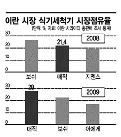 28일 이란의 대표적인 전자상가인 사리아티가 집계한 가전 총판매 자료에 따르면 지난해 이란 내 식기세척기 시장점유율은 동양매직이 28%로 1위다. 독일의 보쉬(22%)와 아에게(17%)가 뒤를 잇고 있다. 단일 품목으로도 동양매직의 6인용과 8인용 식기세척기가 각각 4000대, 1만대 정도 팔리면서 시장점유율 18%를 기록 중이다.
