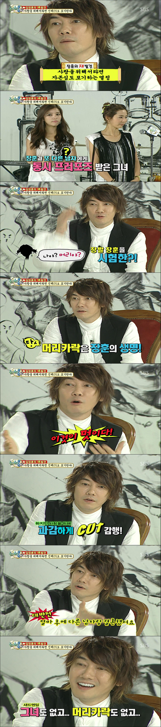 김장훈은 “결혼까지 생각한 사랑한 여자가 있었다”며 “하지만 그녀에게는 나 말고도 다른 남자가 프러포즈를 했다”고 사연을 공개했다. 그 여자는 김장훈과 또 남자에게 동시 프러포즈를 받은 것.
