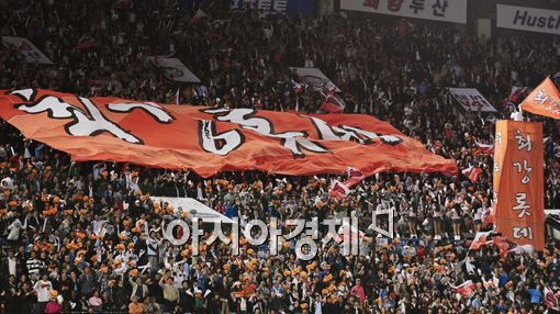 [스포츠투데이 한윤종 기자]29일 오후 서울 잠실구장에서 열린 2010 준플레이오프 1차전 두산 베어스와 롯데 자이언츠의 경기. 9회초 선두타자 롯데 전준우가 역전 솔로홈런을 날리자 롯데팬들이 환호하고 있다.