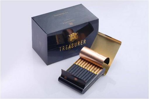 90mm 사이즈로 구성된 트레저 담배는 고급스러운 알루미늄 케이스로 포장돼 있고 진품임을 진명하는 고유의 홀로그램 테이프로 봉인돼 있다. 구입문의는 02-318-1257.